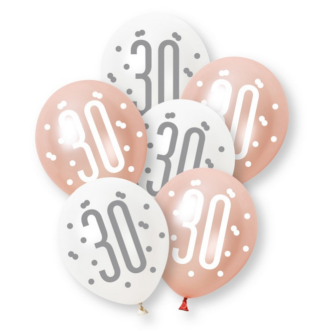 Honour three decades with these breathtaking 12" Rose Gold Number 30 latex balloons. This six-pack showcases an elegant rose gold numeral beautifully paired with lustrous platinum and pearl accents that catch and reflect light magnificently. Ideal for thirtieth birthday celebrations, milestone anniversaries, or significant life events, these balloons instantly transform your venue into a refined, celebratory space. Crafted from premium latex, they deliver exceptional durability and maintain their radiant metallic appearance throughout your entire event. Impress guests with these sophisticated decorations that elegantly commemorate reaching this remarkable age milestone.