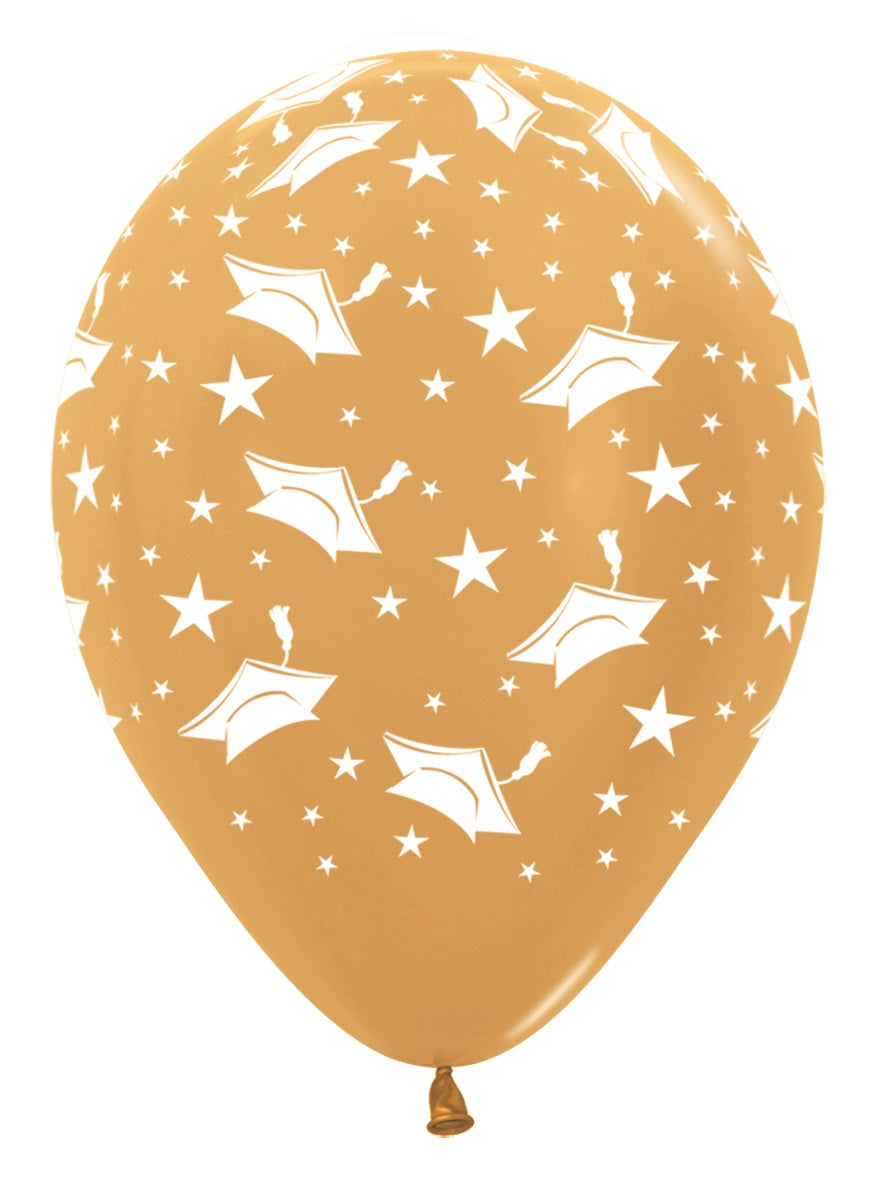 Celebrate your graduate’s success with these 12" Sempertex Graduation Hats Gold Latex Balloons. Each bag includes 25 vibrant balloons featuring elegant graduation cap designs in a rich gold finish, perfect for adding a touch of prestige to any graduation party. Made from durable latex, they ensure long-lasting inflation and eye-catching color to make your celebration truly memorable. Honor the achievement with style and sparkle.