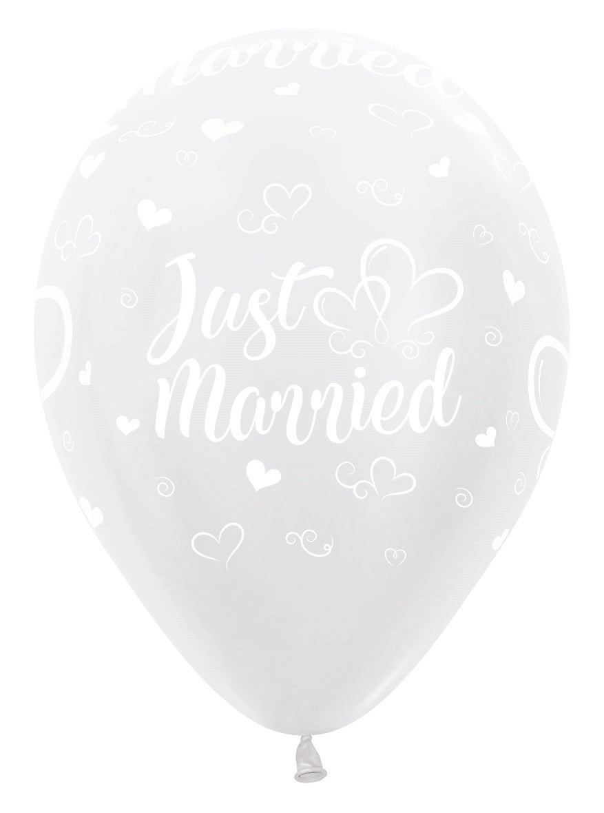 Celebrate love with these 12" Sempertex Just Married Hearts Pearl White Latex Balloons. Each bag includes 25 elegant balloons featuring a romantic heart design, perfect for weddings, receptions, or bridal showers. Crafted from durable latex with a pearl white finish, they add a sophisticated and joyful touch to your special day. Create unforgettable memories with these beautiful balloons.