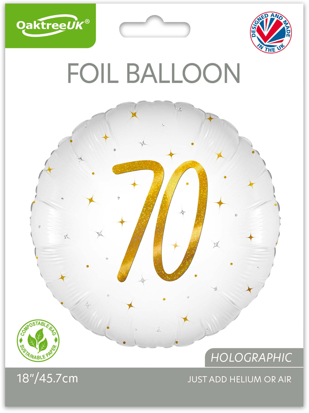 Celebrate a milestone 70th birthday with timeless elegance. This 18" holographic foil balloon features a sophisticated white finish with shimmering sparkle detailing, creating a refined and festive centrepiece for any celebration.
