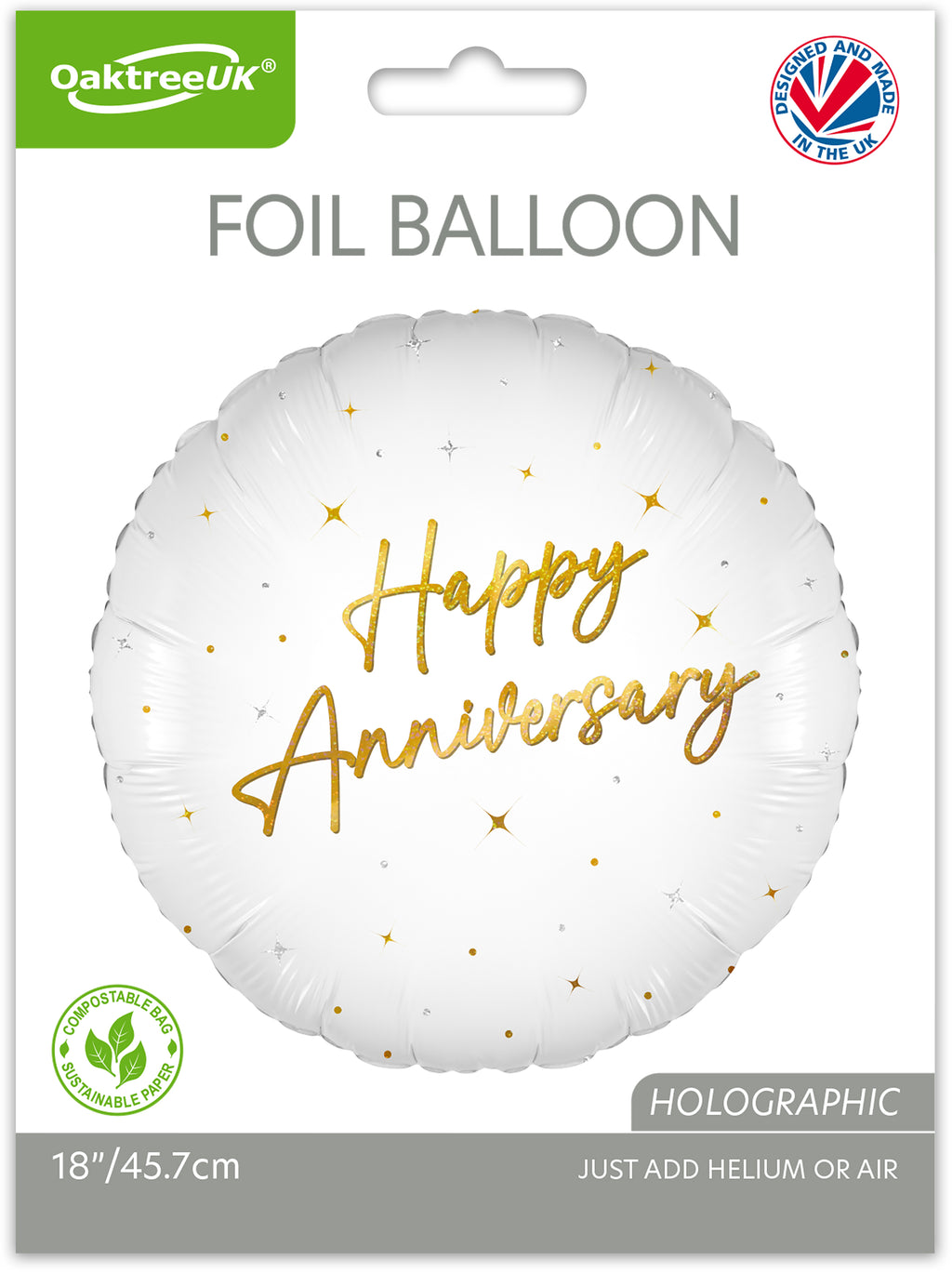 Celebrate a milestone moment with this stunning 18" holographic foil balloon. Featuring elegant sparkle white finish and a heartfelt "Happy Anniversary" message, it brings shimmer and sentiment to any celebration. The holographic surface catches light beautifully, creating a premium, eye-catching display. Perfect for anniversaries, romantic occasions, or as part of a larger balloon arrangement. Easy to inflate with helium for long-lasting impact. A sophisticated choice for couples marking their special day.