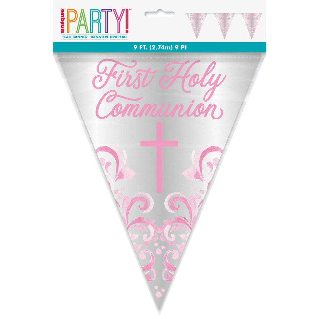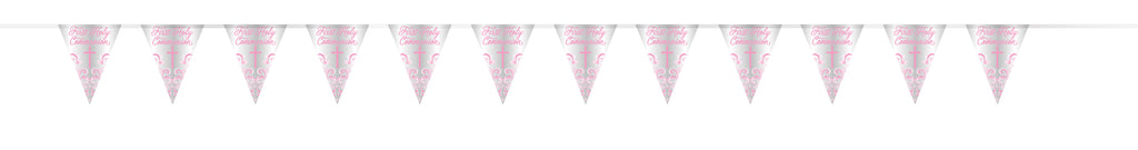 Enhance your celebration with our 9FT Pink Holy Cross First Holy Communion Foil Flag Bunting Banner! Perfect for a girl's First Holy Communion, this banner adds a special touch with its shimmering foil design and symbolic holy cross. A must-have for a beautiful and meaningful event!