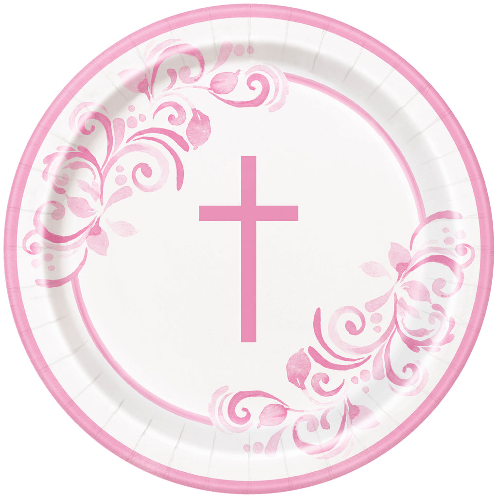 Experience a divine dining experience with our 9" Round Pink Holy Cross Dinner Plates! Each pack contains 8 high-quality plates, adorned with a beautiful holy cross design in a vibrant pink color. Perfect for Communion or Confirmation celebrations, these plates add a meaningful touch to your dining table. Elevate your event with these thoughtfully designed plates.